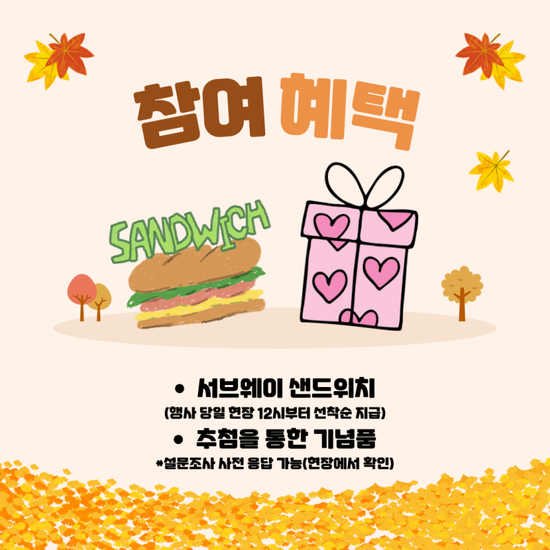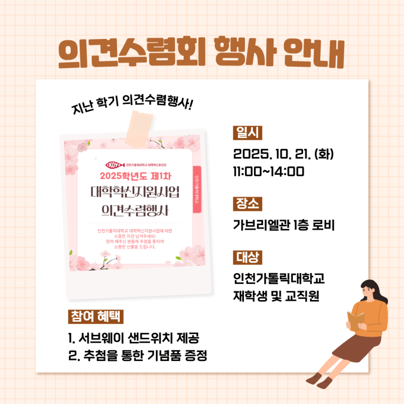 안녕하세요! 인천가톨릭대학교 대학혁신지원사업 익투스 서포터즈입니다! 익투스 서포터즈는 대학혁신지원사업의 일환으로 학교의 소식을 전달하고 있습니다. 중간고사와 각종 일정으로 분주한 시기이지만 가을 햇살처럼 따뜻한 마음으로 하루하루를 채워가시길 바랍니다.  2025학년도 2학기 제2차 의견수렴행사를 진행합니다! 이번 행사는 대학혁신지원사업의 성과를 함께 나누고, 더 나은 학교를 만들기 위한 학생과 교직원의 생생한 의견을 듣는 자리입니다. 참여해주신 분들께는 서브웨이 샌드위치를 제공하며, 추첨을 통해 소정의 기념품도 증정될 예정입니다. 사전 설문 참여 또는 현장 방문 모두 가능하니 많은 참여 부탁드립니다!   인천가톨릭대학교 대학혁신지원사업 익투스 서포터즈 4기 김민지 #익투스서포터즈 #익투스 #대학혁신지원사업 #인천가톨릭대학교 #인가대 #인천가톨릭대학교대학혁신지원사업  |