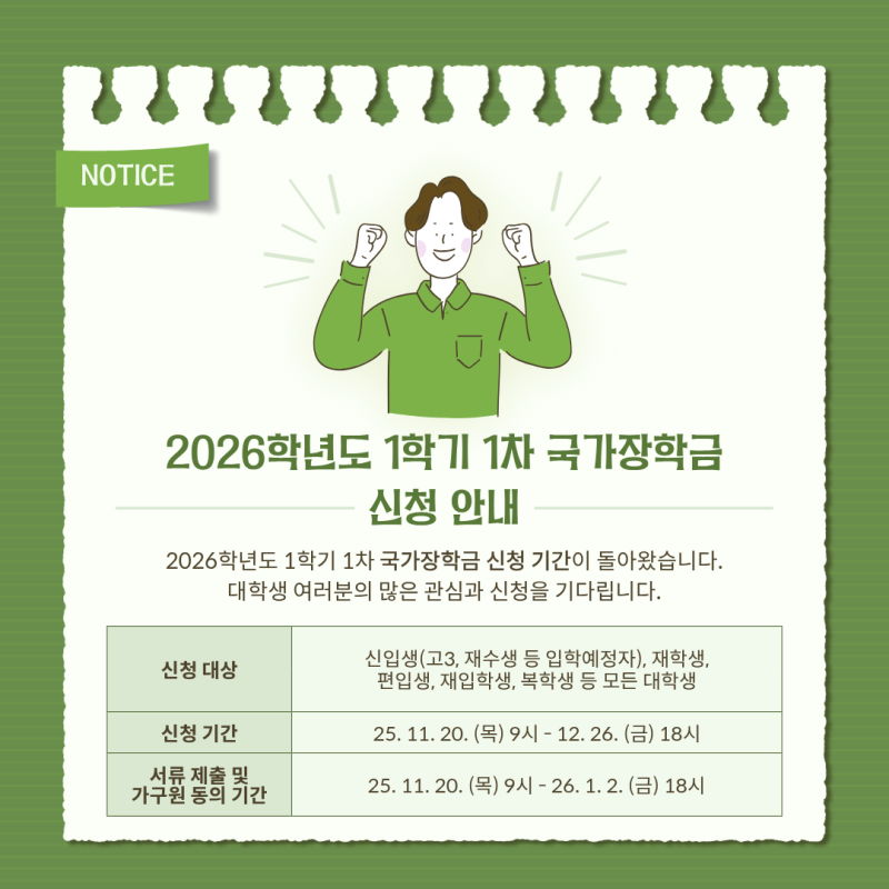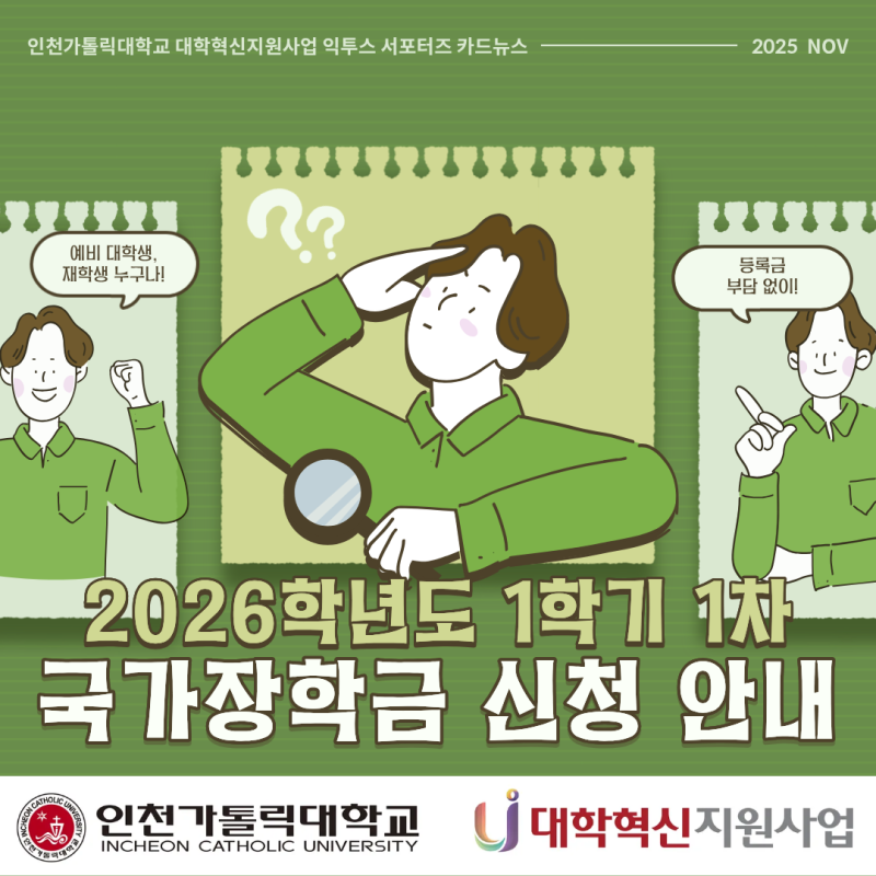 안녕하세요! 인천가톨릭대학교 대학혁신지원사업 익투스 서포터즈입니다! 익투스 서포터즈는 대학혁신지원사업의 일환으로 학교의 소식을 전달하고 있습니다. 1한 학기의 끝이 서서히 모습을 드러내는 달이라 그런지 발표와 과제 때문에 바쁜 학생들이 많을 것이라고 생각됩니다. 곧 다가올 겨울방학을 준비하면서도, 다음 학기 등록금 걱정을 덜기 위해 꼭 챙겨야 하는 일정이 있죠. 바로 2026학년도 1학기 1차 국가장학금 신청입니다! 국가장학금은 등록금 부담을 줄이는 가장 확실한 방법입니다. 특히 1차 신청은 재학생들에게 매우 중요하니 11월~12월 일정 안에 꼭 넣어두고 미리 준비해두시길 바랍니다! 인천가톨릭대학교 대학혁신지원사업 익투스 서포터즈 4기 김민지 #익투스서포터즈 #익투스 #대학혁신지원사업 #인천가톨릭대학교 #인가대 #인천가톨릭대학교대학혁신지원사업 |