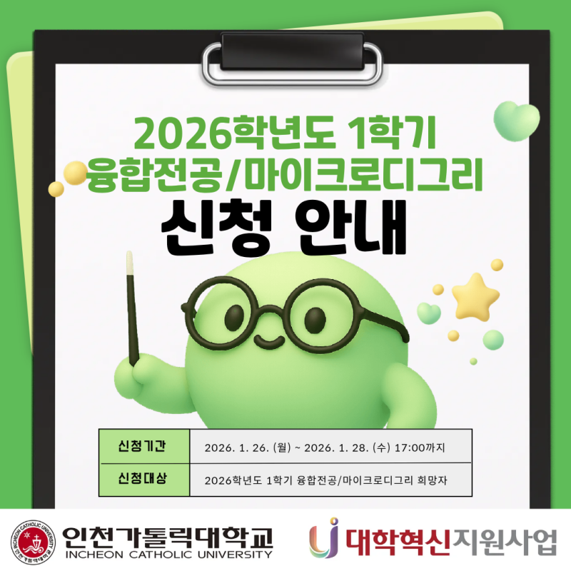 안녕하세요! 인천가톨릭대학교 대학혁신지원사업 익투스 서포터즈입니다! 융합전공과 마이크로디그리는 자신의 진로를 더 선명하게 만들고 실무적 경쟁력을 키우는 유용한 제도입니다. 2026학년도 1학기를 준비하는 학생이라면, 이번 신청 기간을 놓치지 말고 적합한 프로그램을 선택해보세요! 인천가톨릭대학교 대학혁신지원사업 익투스 서포터즈 4기 김민지 #익투스서포터즈 #익투스 #대학혁신지원사업 #인천가톨릭대학교 #인가대 #인천가톨릭대학교대학혁신지원사업 |