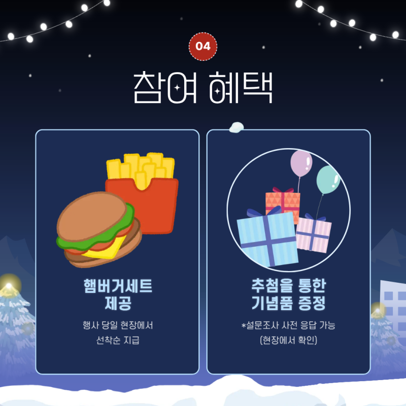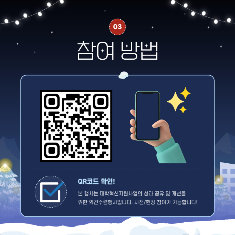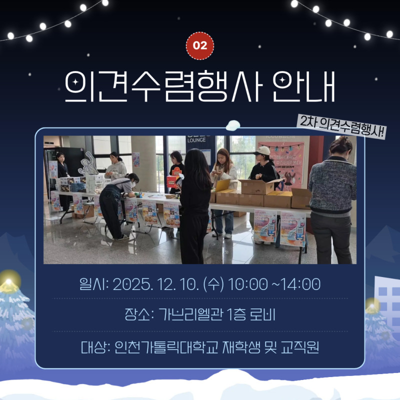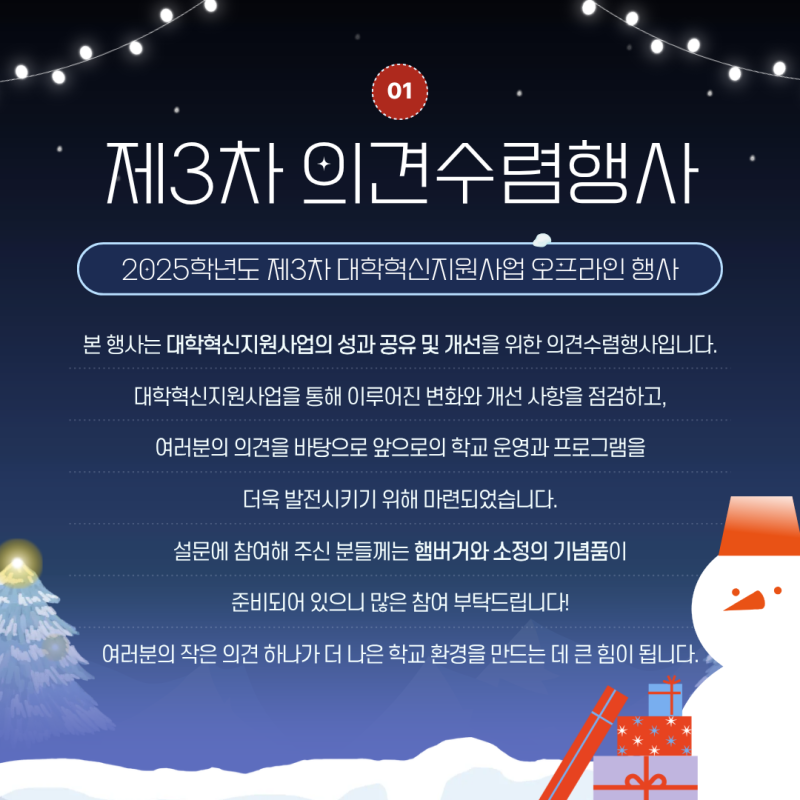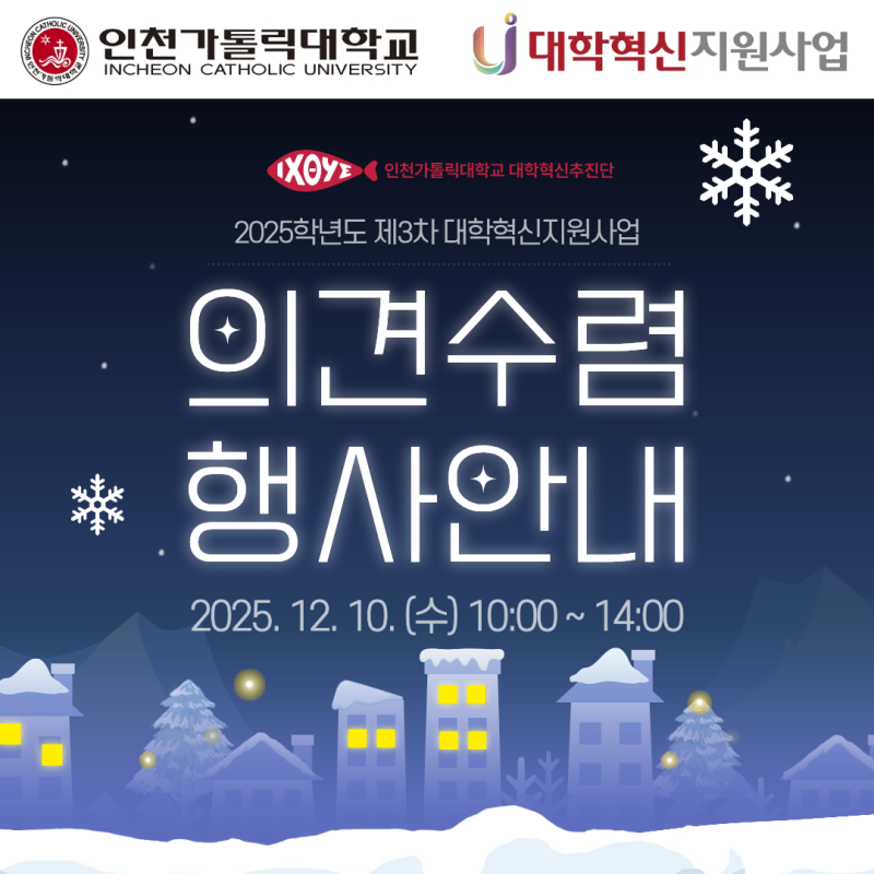 안녕하세요! 인천가톨릭대학교 대학혁신지원사업 익투스 서포터즈입니다! 익투스 서포터즈는 대학혁신지원사업의 일환으로 학교의 소식을 전달하고 있습니다. 한겨울 12월이 돌아왔습니다, 날씨가 많이 추운데요. 차가운 바람 속에서도 서로에게 온기가 되는 겨울 되시길 바랍니다. 2025학년도 2학기 제3차 의견수렴행사를 진행합니다! 2학기 마지막 의견 수렴 행사로 대학혁신지원사업의 성과를 함께 나누고, 더 나은 학교를 만들기 위한 학생과 교직원의 생생한 의견을 듣는 자리입니다. 참여해주신 분들께 햄버거 세트를 제공하며, 추첨을 통해 소정의 기념품도 증정할 예정입니다. 사전 설문 참여 또는 현장 방문 모두 가능하니 많은 참여 부탁드립니다! 인천가톨릭대학교 대학혁신지원사업 익투스 서포터즈 4기 김민지 #익투스서포터즈 #익투스 #대학혁신지원사업 #인천가톨릭대학교 #인가대 #인천가톨릭대학교대학혁신지원사업 |