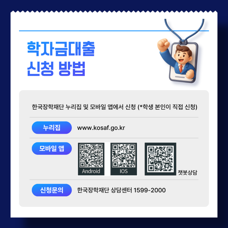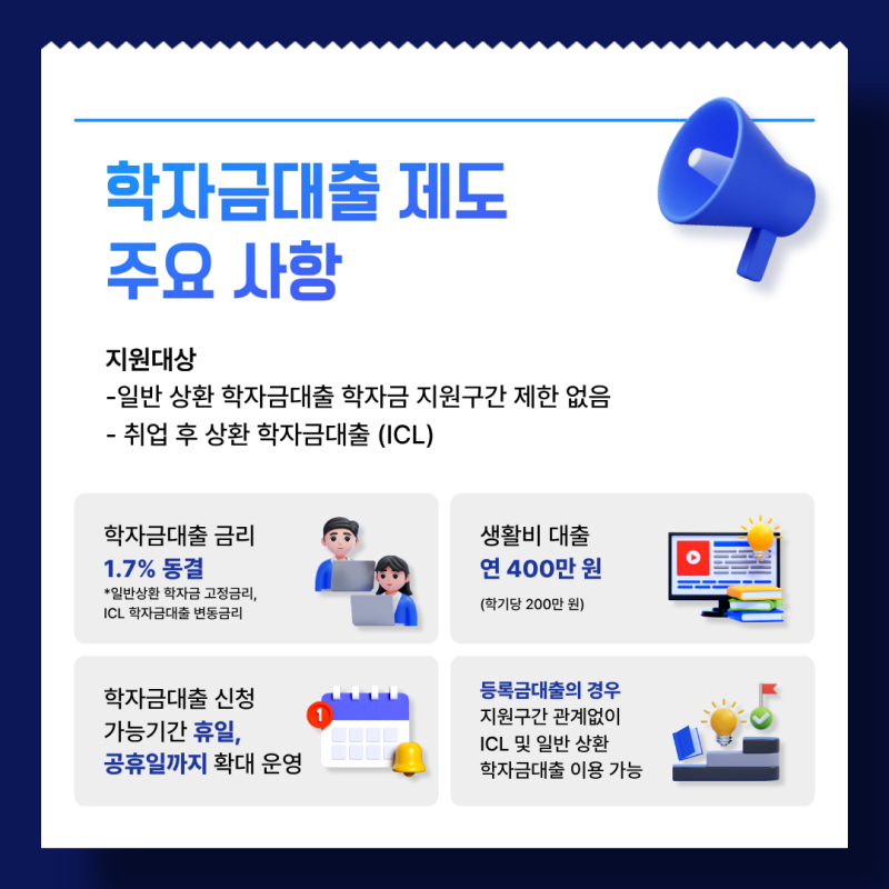 안녕하세요! 인천가톨릭대학교 대학혁신지원사업 익투스 서포터즈입니다! 익투스 서포터즈는 대학혁신지원사업의 일환으로 학교의 소식을 전달하고 있습니다. 새해와 함께 2026년도 1월이 시작되었습니다. 각자의 자리에서 따뜻한 하루를 쌓아가는 달이 되기를 바랍니다. 2026년도 학자금 대출 신청 기간이 시작되었습니다. 등록금 납부와 생활비 마련에 도움이 되는 제도인 만큼 대상과 기간, 주요 변경 사항을 미리 확인하시기 바랍니다. 학자금대출은 학업을 이어가는 데 있어 중요한 지원 제도입니다. 신청 대상과 기간을 꼼꼼히 확인하시고, 필요한 경우 미리 신청을 완료하시기 바랍니다. 인천가톨릭대학교 대학혁신지원사업 익투스 서포터즈 4기 김민지 #익투스서포터즈 #익투스 #대학혁신지원사업 #인천가톨릭대학교 #인가대 #인천가톨릭대학교대학혁신지원사업 |