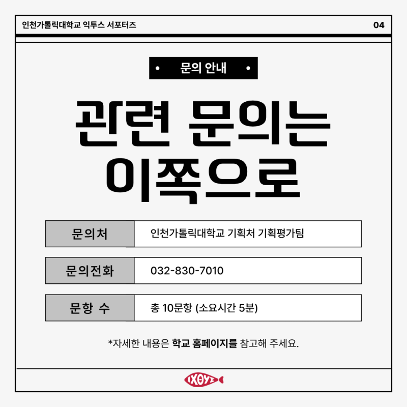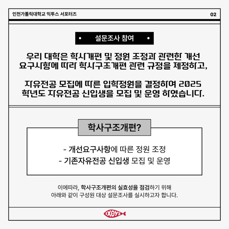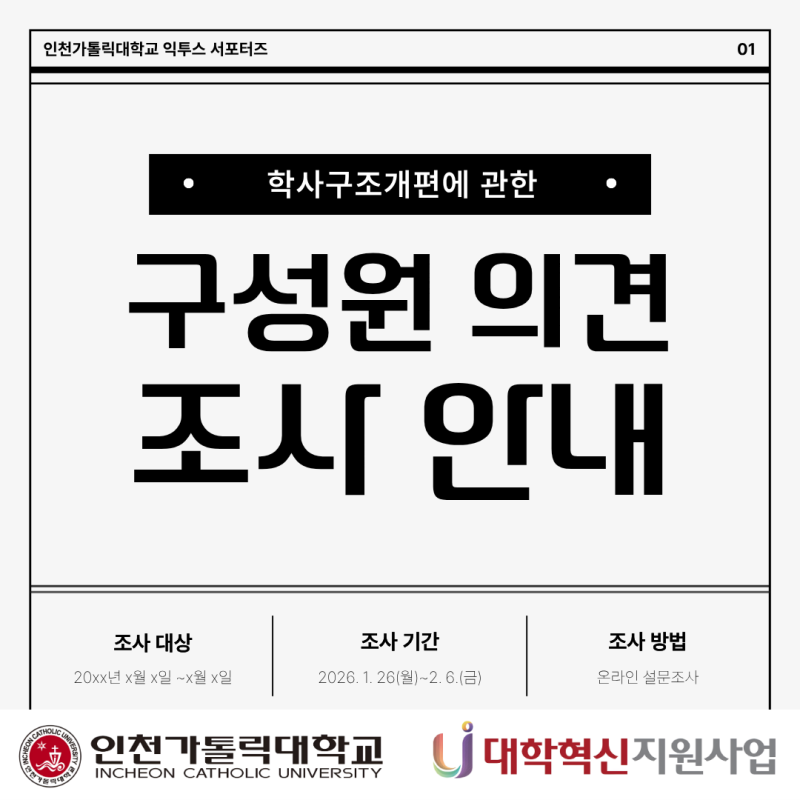 안녕하세요! 인천가톨릭대학교 대학혁신지원사업 익투스 서포터즈입니다! 익투스 서포터즈는 대학혁신지원사업의 일환으로 학교의 소식을 전달하고 있습니다. 새해의 첫 달, 1월이 어느덧 저물어 갑니다. 마음만큼은 따뜻하게 마무리하는 1월을 보내시길 바랍니다. 우리 대학에서는 학사구조개편과 관련한 제도 운영의 실효성을 점검하고, 향후 보다 합리적인 학사 운영 방향을 모색하기 위해 대학 구성원을 대상으로 설문조사를 실시합니다. 구성원 여러분의 의견은 향후 학사제도 개선과 운영 방향 설정에 중요한 기준이 됩니다. 잠시 시간을 내어 설문에 참여해 주시길 바라며 많은 관심과 협조 부탁드립니다. 인천가톨릭대학교 대학혁신지원사업 익투스 서포터즈 4기 김민지 #익투스서포터즈 #익투스 #대학혁신지원사업 #인천가톨릭대학교 #인가대 #인천가톨릭대학교대학혁신지원사업 |
