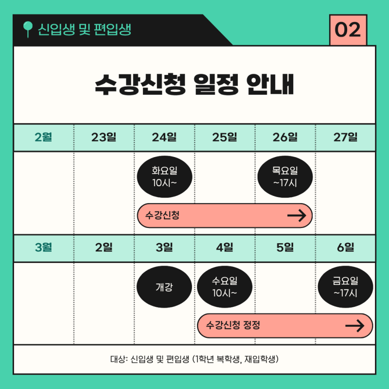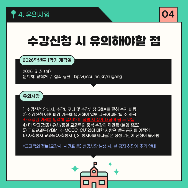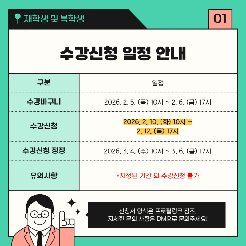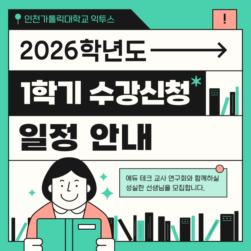 안녕하세요! 인천가톨릭대학교 대학혁신지원사업 익투스 서포터즈입니다! 익투스 서포터즈는 대학혁신지원사업의 일환으로 학교의 소식을 전달하고 있습니다. 여전히 추위가 이어지고 있지만 차분히 다음 학기를 준비하며 따뜻하게 1월을 마무리하시길 바랍니다. 2026학년도 1학기 수강신청 일정이 안내되었습니다. 대상별로 신청 기간이 다르니 본인에 해당하는 일정을 꼭 확인하시기 바랍니다. 지정된 기간 외에는 수강신청이 불가하니 반드시 기간 내 진행해 주세요! 수강신청은 학기 운영의 중요한 첫 단계입니다. 일정을 미리 확인하시고, 여유 있게 준비하여 불이익이 없도록 유의해 주세요. 자세한 사항은 학사 공지 및 학교 홈페이지를 참고해 주시기 바랍니다. 인천가톨릭대학교 대학혁신지원사업 익투스 서포터즈 4기 김민지 #익투스서포터즈 #익투스 #대학혁신지원사업 #인천가톨릭대학교 #인가대 #인천가톨릭대학교대학혁신지원사업 |